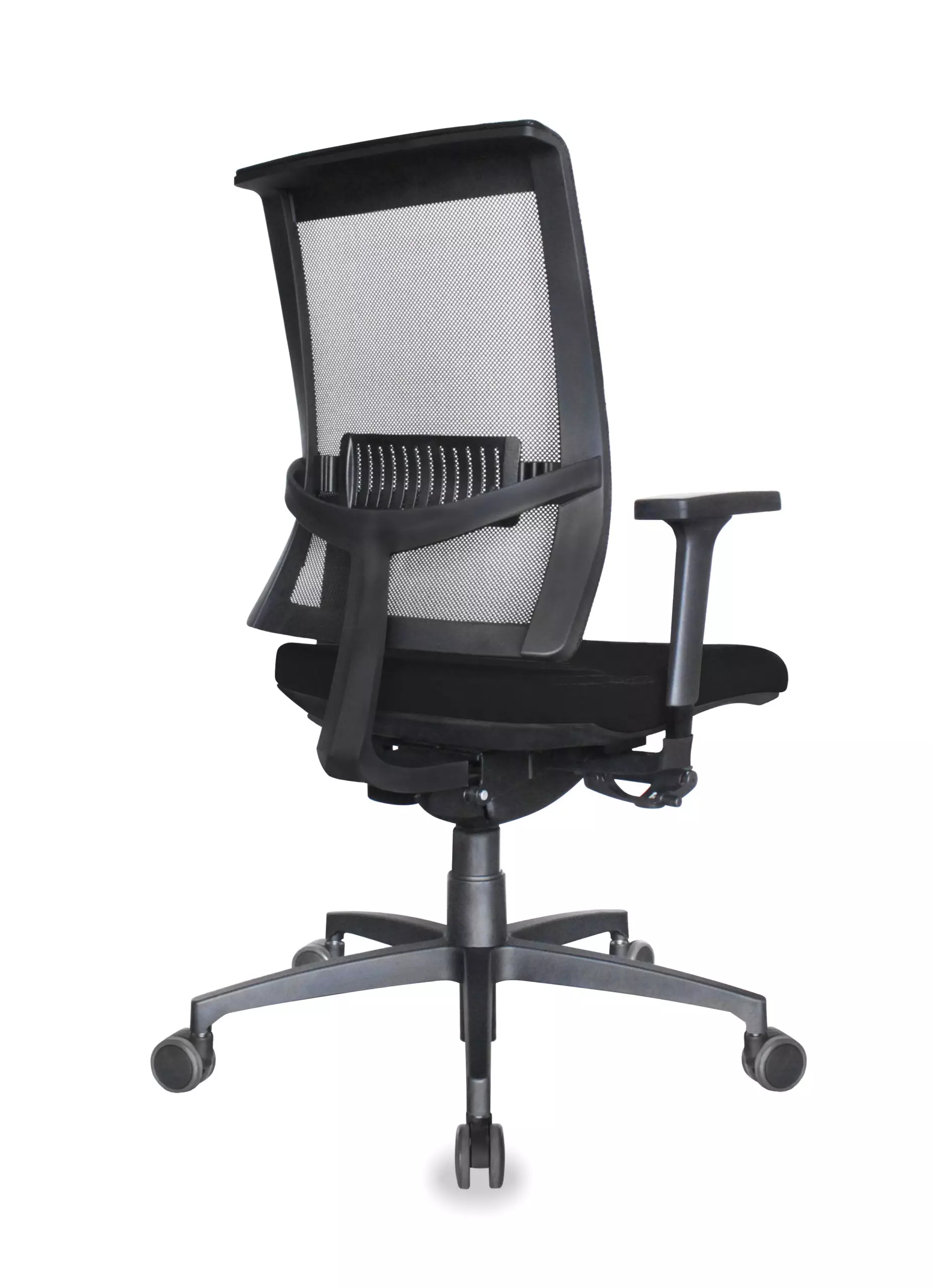 O encosto é completado por um suporte lombar com altura regulável, fabricado em material plástico levemente elástico para melhor acomodar o usuário quando este se apoiar. A estrutura metálica do encosto é parafusada ao mecanismo sincronizado.