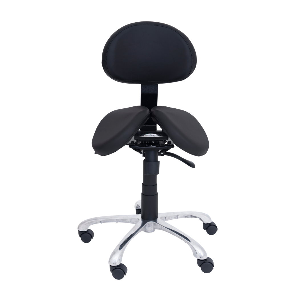 Assim como o modelo Poli, este mocho sela conta com regulagem de inclinação e abertura da sela, permitindo adaptação precisa à anatomia do usuário e favorecendo o alinhamento correto da coluna. O grande diferencial está no encosto regulável, que oferece apoio adicional às costas, reduzindo a fadiga muscular em procedimentos prolongados.